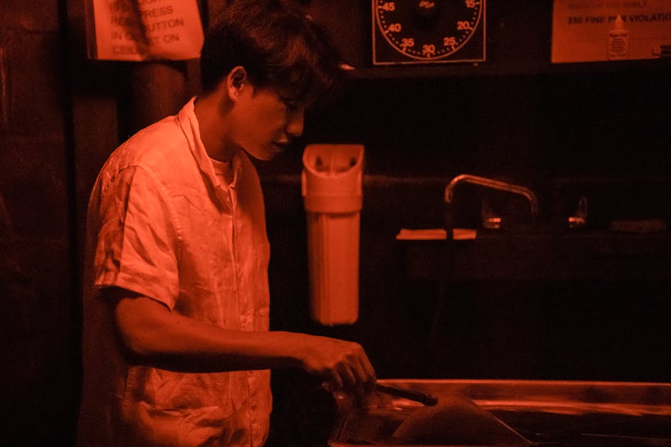 A photographer processes images in a dimly lit darkroom, utilizing traditional techniques.